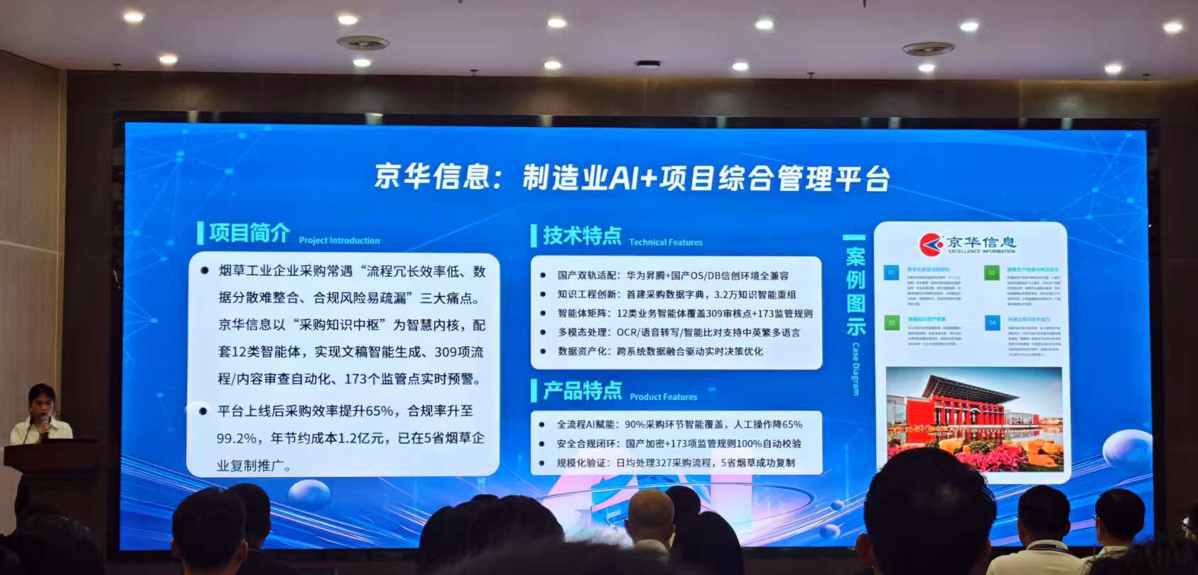 在颁证现场,京华信息副总裁李锦洲代表企业接受荣誉证书时表示:“感谢对京华‘国产化AI中台+智能体矩阵’技术路线的认可!我们将持续以安全可控的AI能力,推动制造业全流程智能化重构,让行业知识工程创新惠及更多实体经济场景。”